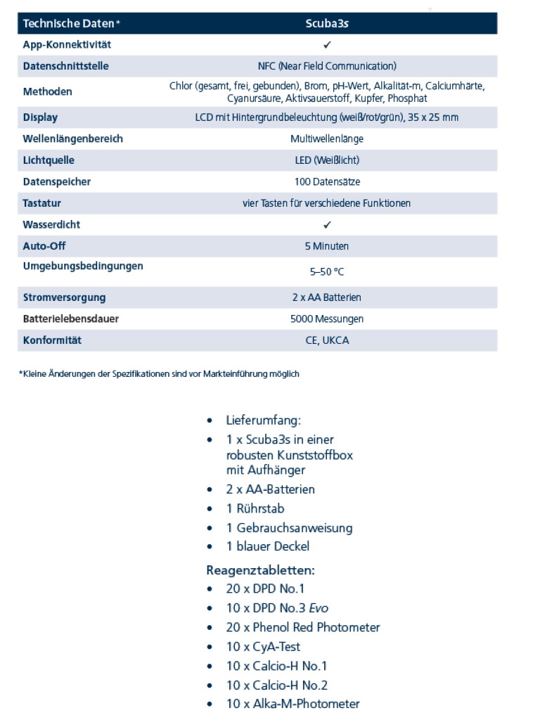 Zum Lieferumfang Pooltester Photometer Scuba 3 S gehören: Â