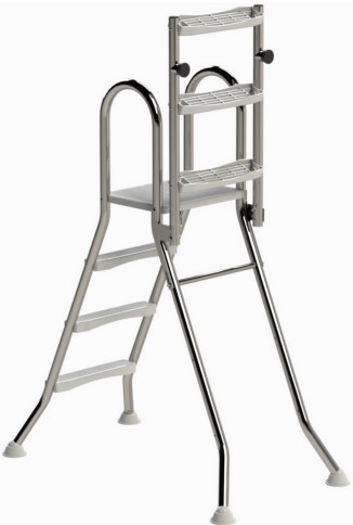 Schwimmbad Hochbeckenleiter aus V2A Edelstahl, Holmdurchmesser 43 mm, poliert, flexible PVC-Füße, Plattform (370 x 460 mm), Stufen aus rutschfestem Kunststoff, weiß.